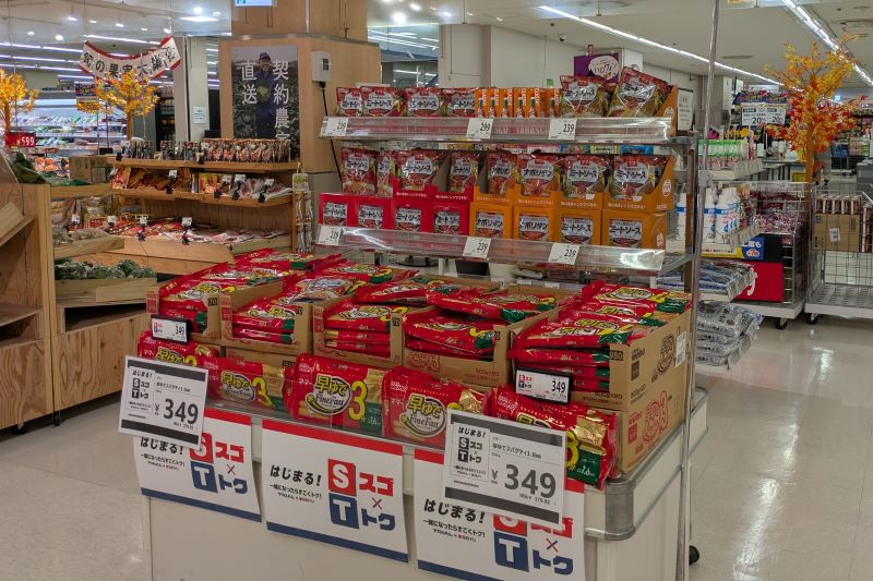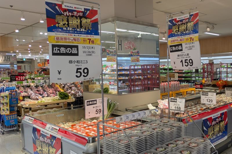 華美な飾り付けよりも、 商品が山積みされた台や、目を引く大きな価格ポップで、しっかりと「価格」で勝負している印象です。