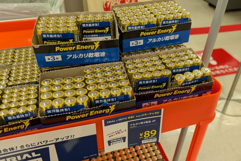 - アルカリ乾電池(単3・単4 4P):89円(税込97.90円)。食料品だけでなく、乾電池のような消耗品までこの価格帯で提供されるのは、トライアルの「安さ」へのこだわりを感じさせます。