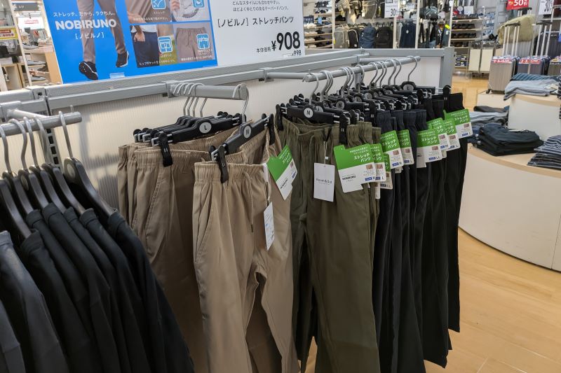 - ノビルノ ストレッチパンツ:908円(税込998.80円)。日常使いしやすいシンプルなデザインの衣料品が手頃な価格で提供されていました。